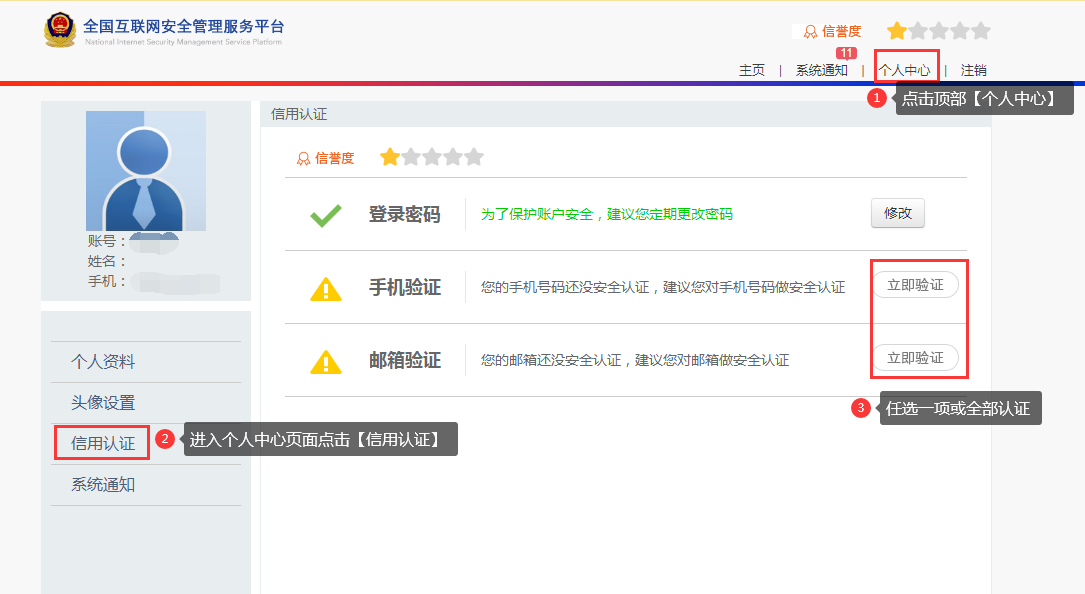 1.2 注册完成后登陆您的账号,登陆后在首页点击【个人中心】进入个人中心页面,点击左侧菜单栏【信用认证】,完成其中一项进行验证或全部信息进行验证。