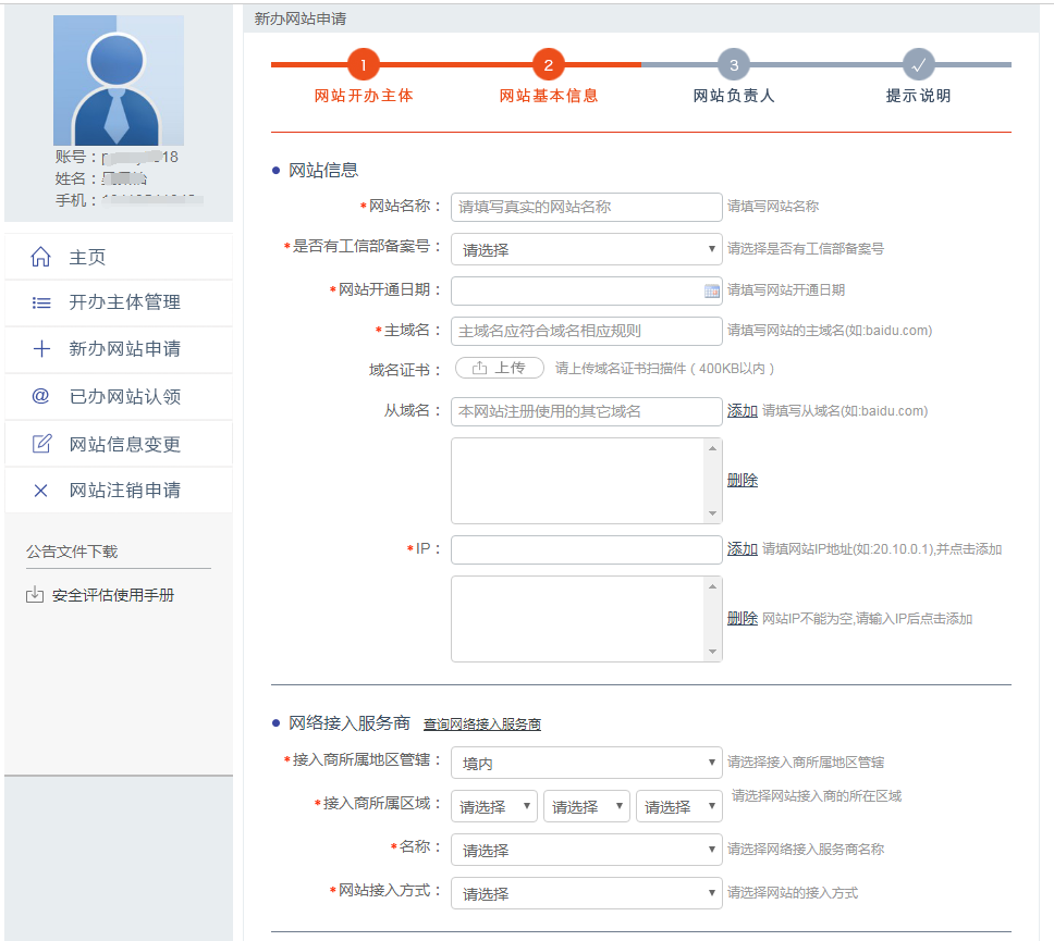 完成网站开办主体填写后进入网站基本信息填写,请根据页面提示完成信息填写。